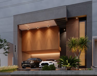 A fachada é trabalhada em uma volumetria contemporânea, trazendo um visual imponente e sofisticado. A área da garagem se destaca com um pé-direito duplo, enquanto a volumetria sobre a garagem com acabamento amadeirado, confere um toque moderno e marcante ao design. A composição de cores neutras e contrastantes harmoniza o conjunto e valoriza os detalhes arquitetônicos.